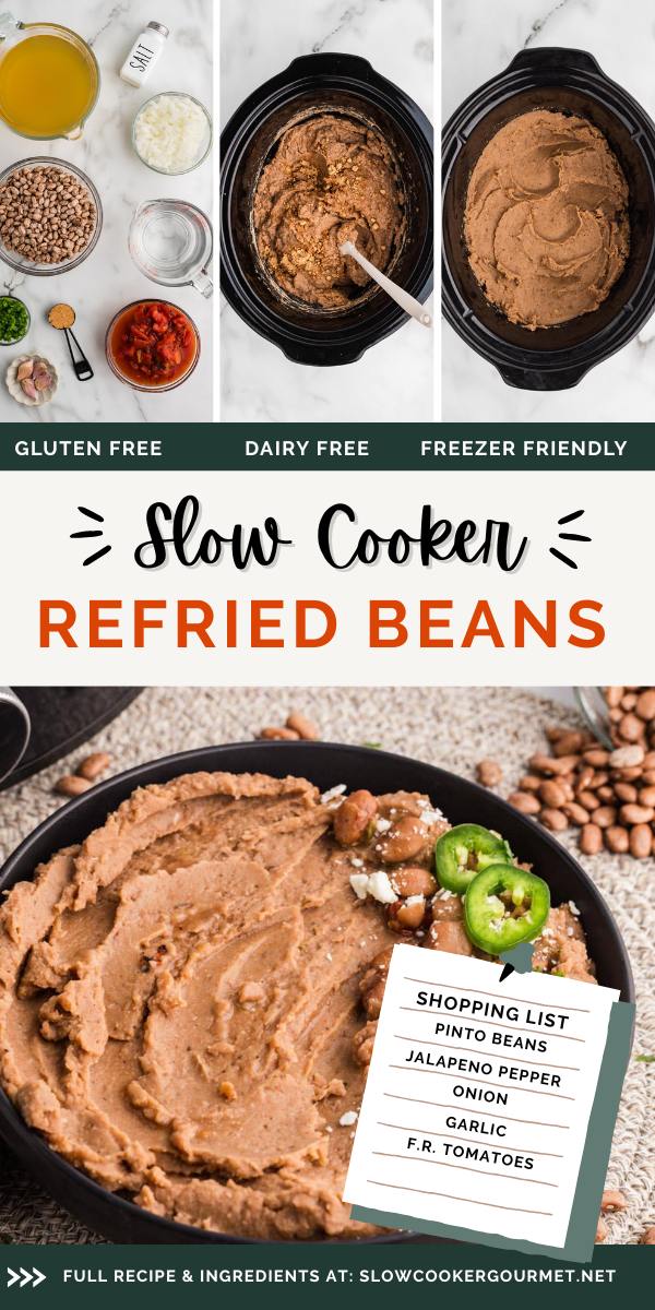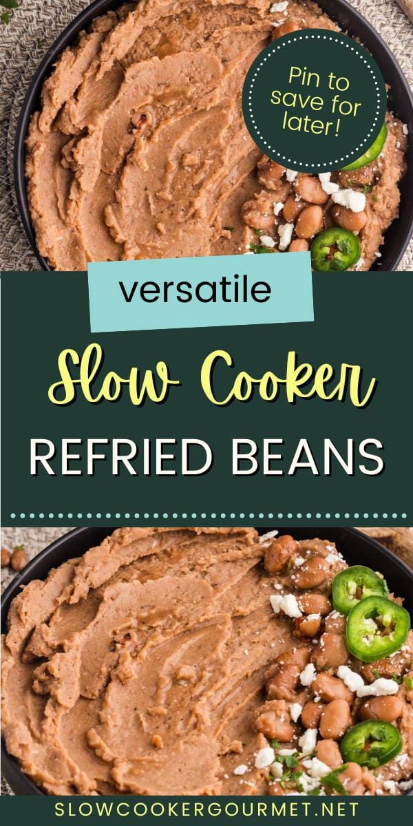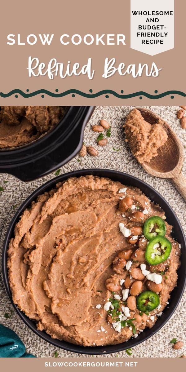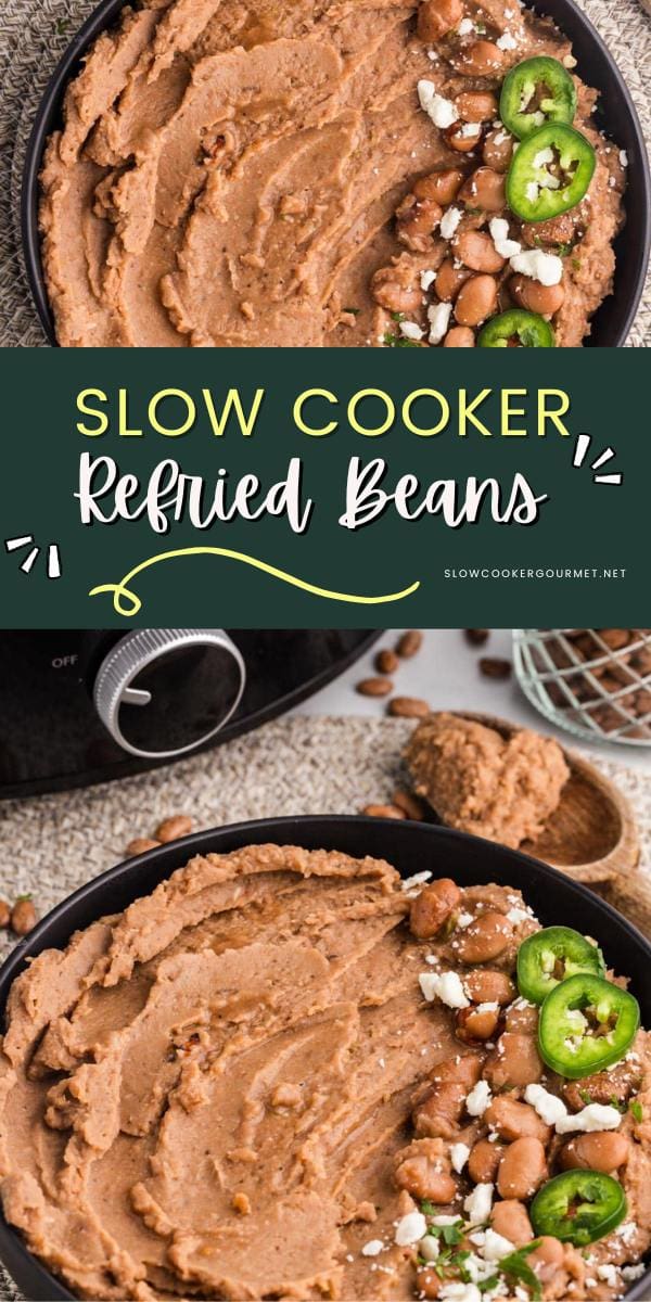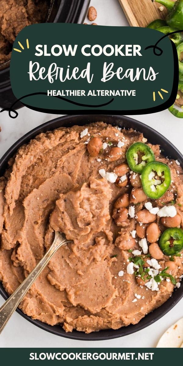 Serve refried beans as a side dish for Slow Cooker Carnitas or Slow Cooker Shredded Chicken Tacos, or spread a scoop onto tostadas, burritos, or quesadillas.