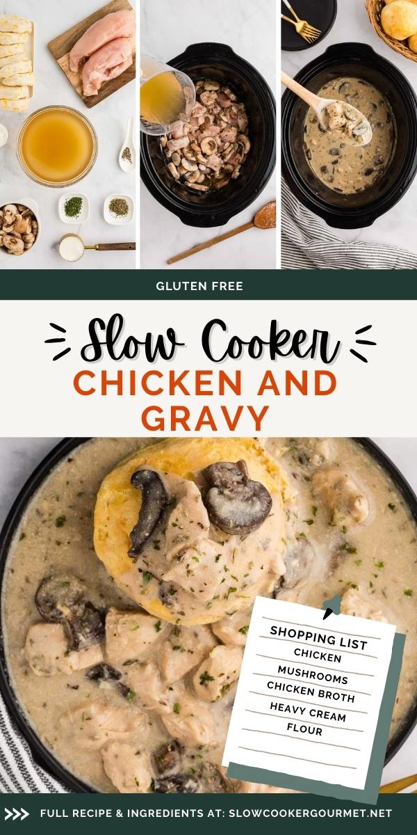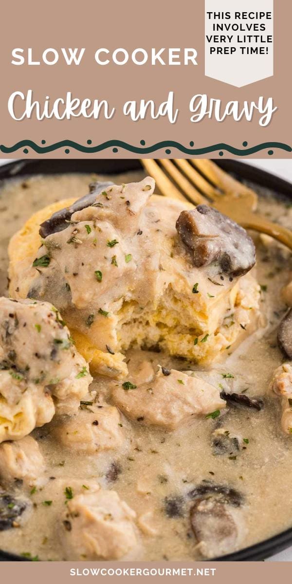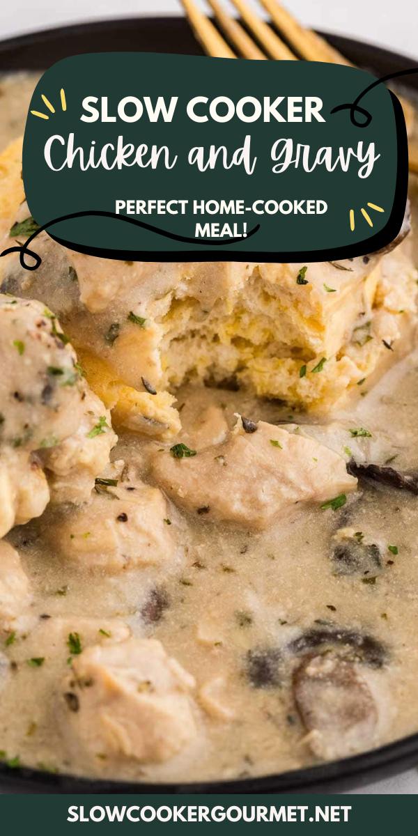 This comfort dish is calling your name! Slow Cooker Chicken and Gravy combines a creamy, made-from-scratch sauce with hearty mushrooms and tender chicken. Add some fresh, flaky biscuits and enjoy the perfect home-cooked meal!