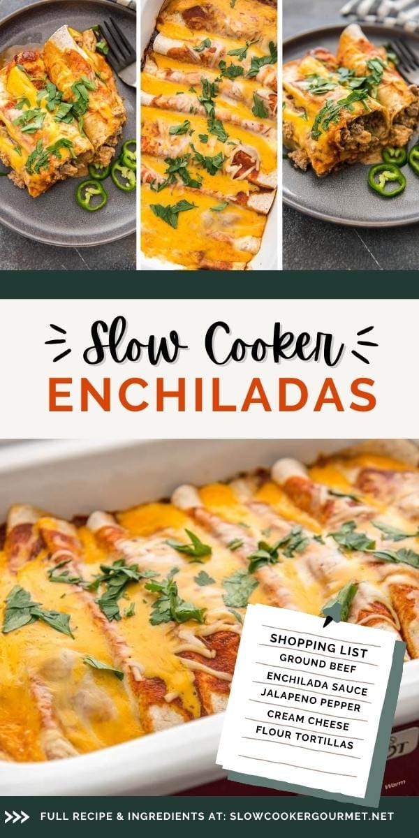 You may think ground beef enchiladas are boring, but this recipe helps take them up a notch or ten from okay to amazing. It’s easy enough to brown up some ground beef, but adding just two ingredients to that will make these enchiladas so flavorful and delicious. Freshly diced jalapeños give a little kick and cream cheese give it just the right amount of reach creamy flavor to make these your new favorite for a weeknight dinner. Even delicious enough to serve up when company comes, slow cooker enchiladas will become your new favorite go-to.
