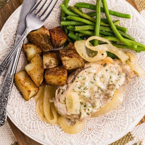 For a hearty weeknight comfort meal, serve the savory pork chops over a bed of Slow Cooker Mashed Potatoes, fluffy rice, or buttery egg noodles. Get every last bite of flavor by spooning the cooked onions and sauce generously over the pork.