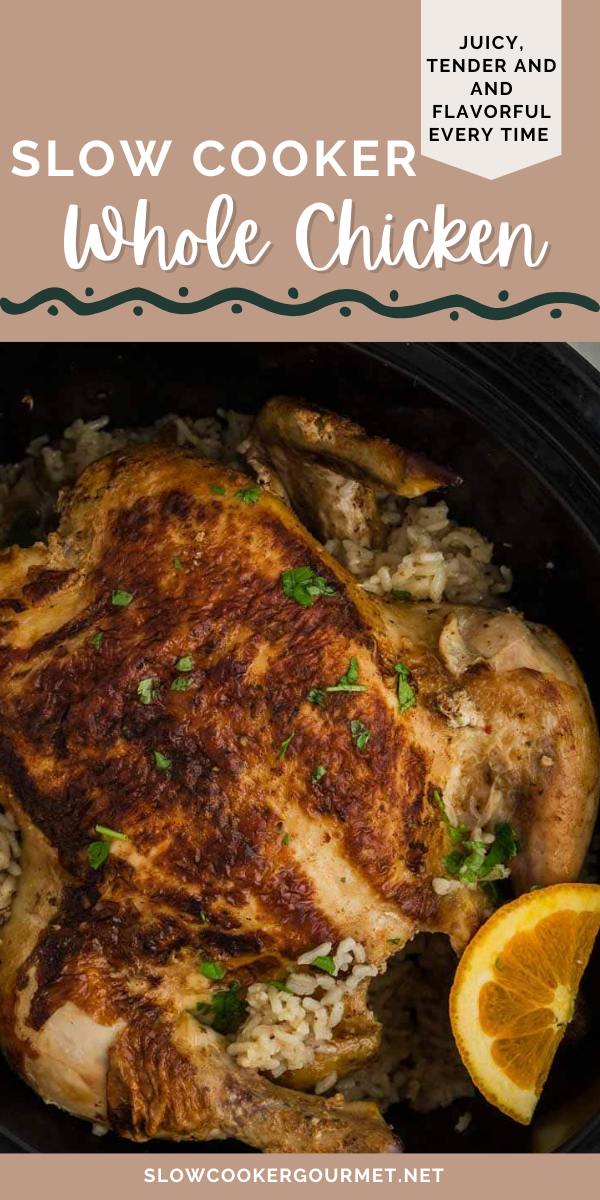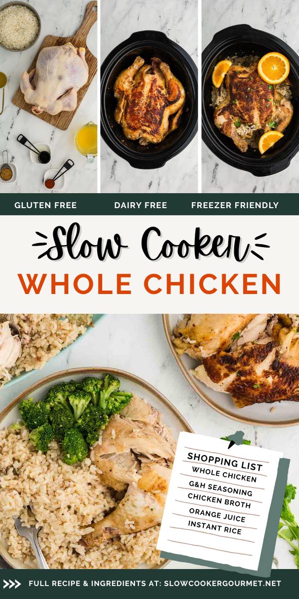 - Whole chicken – Choose a whole chicken (around 3 pounds) to fit properly into most slow cookers that hold a minimum of 4 quarts. You can purchase the highest quality that you like. It’s easy to buy these on sale and keep them frozen until ready to defrost and cook!