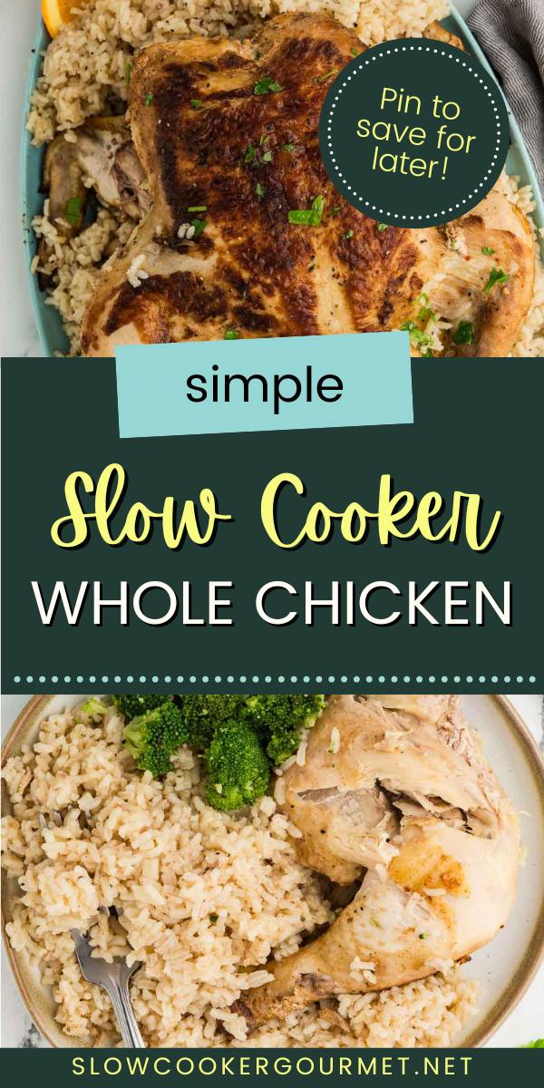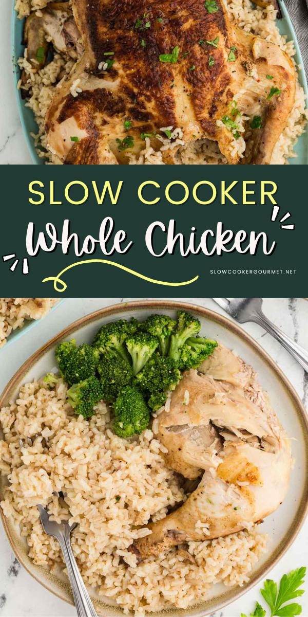 A whole chicken is my all-time favorite recipe to make in the slow cooker. You can easily make a delicious home-cooked meal and use the leftover chicken in so many different ways later on! Serve it with some easy rice and veggies or shred the meat to add to lots of tasty meals.